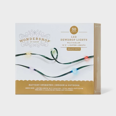Round out your seasonal display with the magical glow of these 50-Count LED Heavy-Duty Dewdrop Christmas Fairy String Lights from Wondershop™. Featuring a dark green wire adorned with 50 multicolor dewdrop LED bulbs, these fairy string lights add a dreamy, glowing touch to indoor and outdoor spaces with their constant light effect. Weave these lights through your banister, spiral them around your tree, or line them around your winter holiday scene for festive shine.
