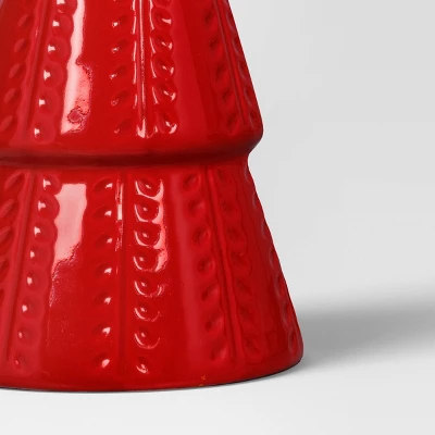 Jazz up your festive display with this 8-Inch Christmas Tree-Shaped Decor from Wondershop™. Made from ceramic, this red Christmas tree figurine features a four-tiered cone silhouette with leaf-like indentations for an eye-catching look. Display it on the mantel or console table or as a centerpiece on your dining table to instantly brighten your space with holiday cheer.